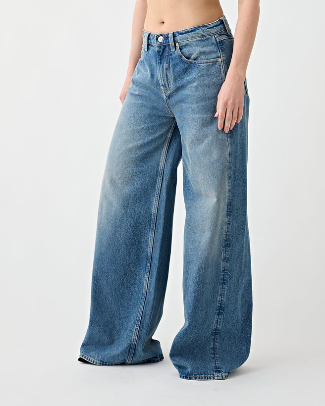 فیت “فول بگ” زنانه به معنای رها کردن کامل فرم بدن است. برخلاف فیتهای راسته یا مام استایل که هنوز کمی ساختار دارند، در فول بگ، تمرکز کامل بر روی حجم و حرکت پارچه است. رنگ آبی کلاسیک در این فیت، تضادی زیبا ایجاد میکند؛ زیرا آبی سنتی است، اما حجم پارچه کاملاً مدرن و افراطی است.